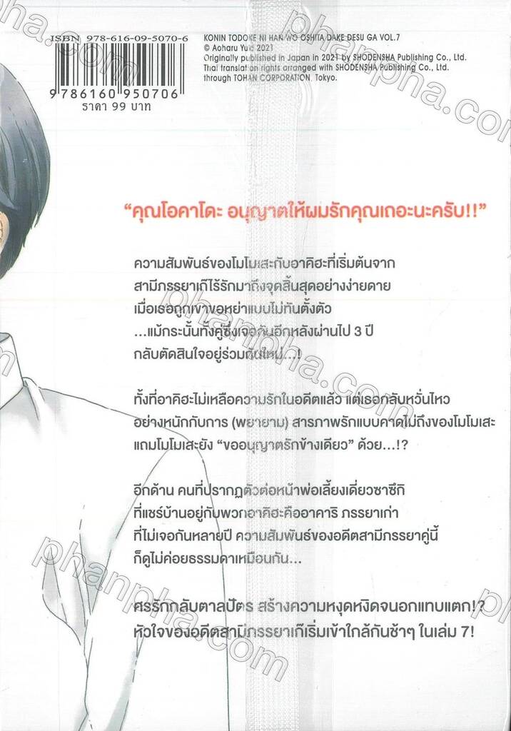 ความสัมพันธ์ของโมโมเสะกับอาคิฮะที่เริ่มต้นจากสามีภรรยาเก๊ไร้รัก มาถึงจุดสิ้นสุดอย่างง่ายดายเมื่อเธอถูกเขาขอหย่าแบบไม่ทันตั้งตัว …แม้กระนั้น ทั้งคู่ซึ่งเจอกันอีกหลังผ่านไป 3 ปี กลับตัดสินใจอยู่ร่วมกันใหม่…! ทั้งที่อาคิฮะไม่เหลือความรักในอดีตแล้ว แต่เธอกลับหวั่นไหวอย่างหนักกับการ(พยายาม)สารภาพรักคาดไม่ถึงของโมโมเสะ แถมโมโมเสะยัง “ขออนุญาตรักข้างเดียว” ด้วย…!? อีกด้าน คนที่ปรากฎตัวต่อหน้าพ่อเลี้ยงเดี่ยว ซาซึกิที่แชร์บ้านอยู่กับพวกอาคิฮะ คืออาคาริ ภรรยาเก่าที่ไม่เจอกันหลายปี ความสัมพันธ์ของอดีตสามีภรรยาคู่นี้ก็ดูไม่ค่อยธรรมดาเหมือนกัน… ศรรักกลับตาลปัตร สร้างความหงุดหงิดจนอกแทบแตก!? หัวใจของอดีตสามีภรรยาเก๊เริ่มเข้าใกล้กันช้าๆ ในเล่ม 7!