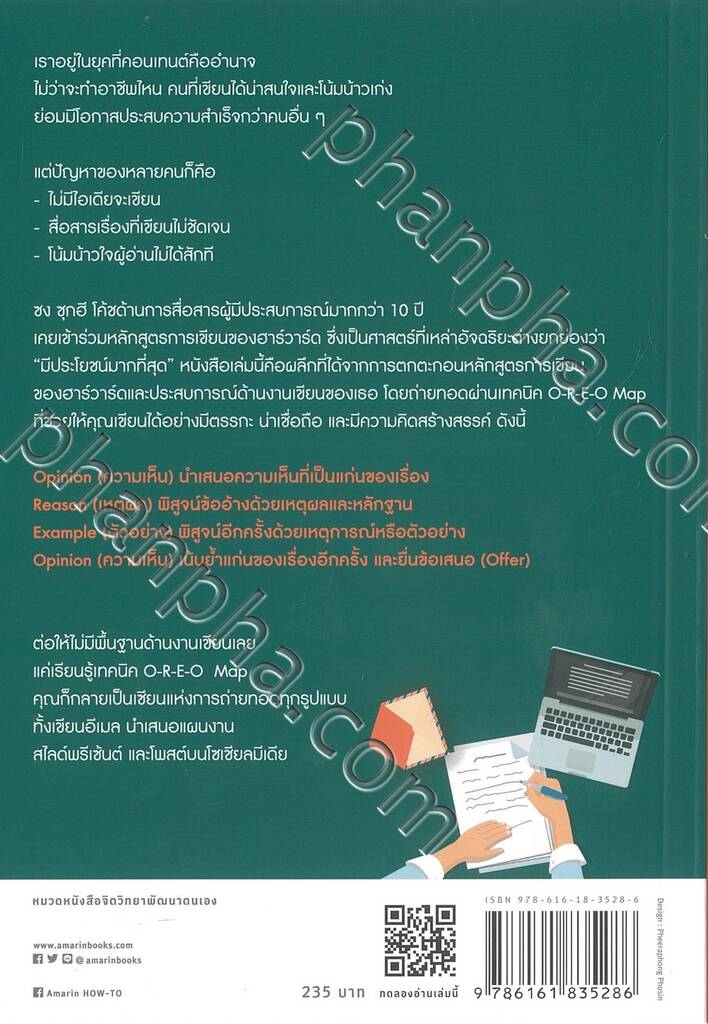หนังสือที่สรุปเทคนิคการเขียนจากมหาวิทยาลัยฮาร์วาร์ดที่ได้รับการยอมรับและถ่ายทอดต่อกันมาเป็นเวลา 150 ปี ด้วยเทคนิค O-R-E-O Map (Opinion Reason Example and opinion) ที่จะลับฝือมือการเขียนของคุณให้ยอดเยี่ยม ฉับไว จูงใจ ครบถ้วนในเล่มเดียว